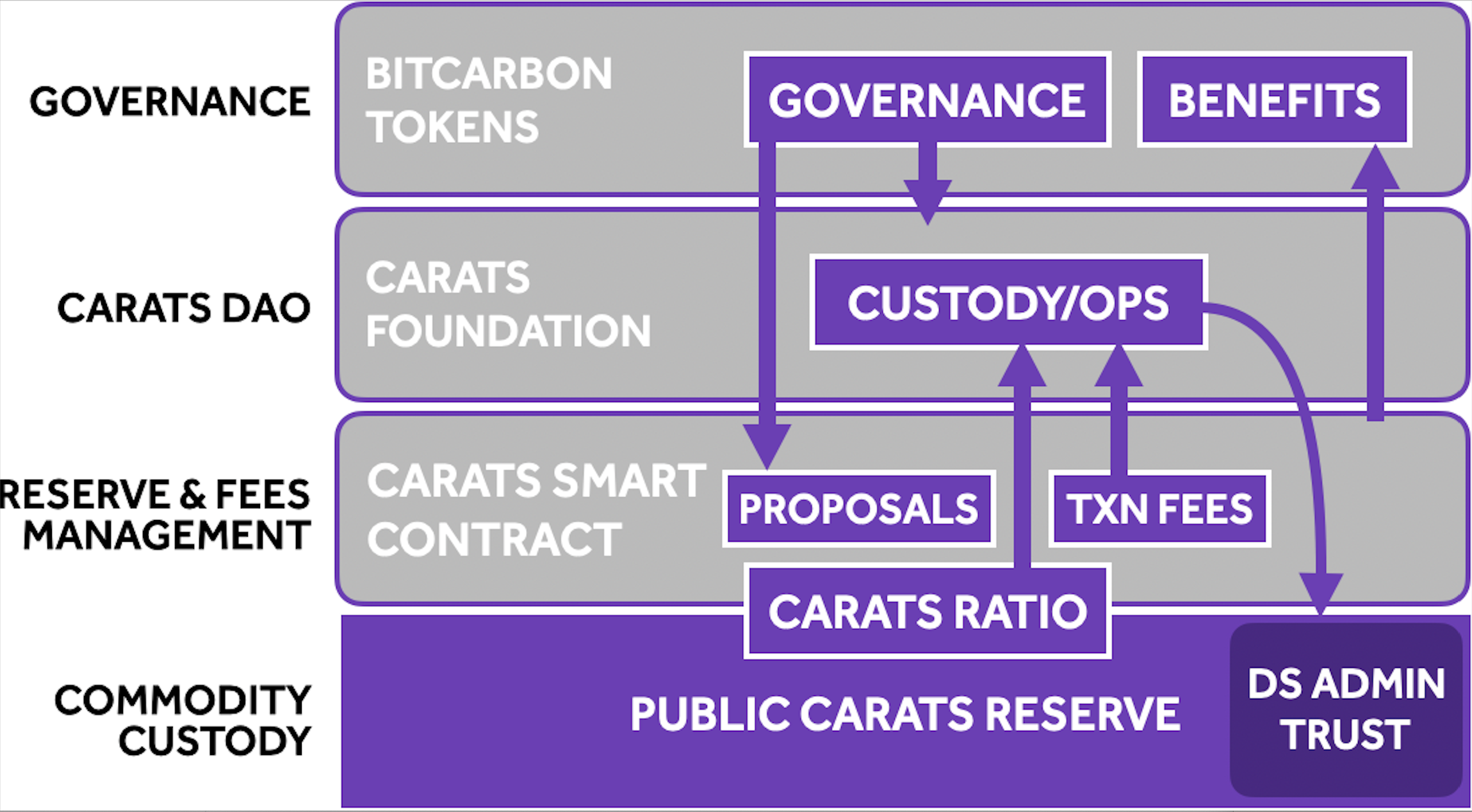 The Carats Smart Contract collects fees in Carats to pay for the operation of the Carats Protocol, especially to pay the custodians holding the Diamond Standard Commodities. The Bitcarbon Foundation has engaged DS Admin Trust to administer the physical custody of the Carats reserve in the vaults of qualified custodians, including Brinks, Loomis and Malca Amit.